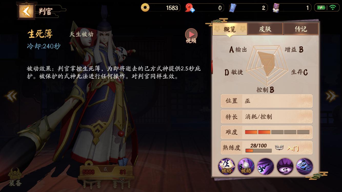 效果:判官掌控生死簿,为即将逝去的己方式神提供2.5秒庇护。被保护的式神无法进行任何操作。对判官同样生效。