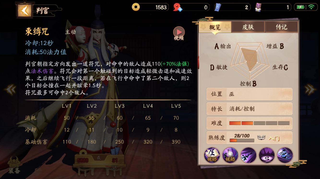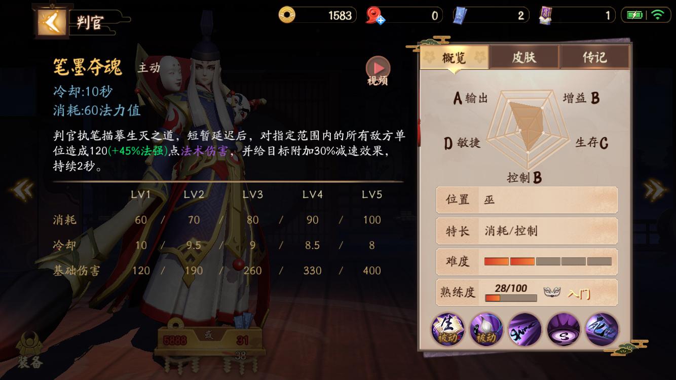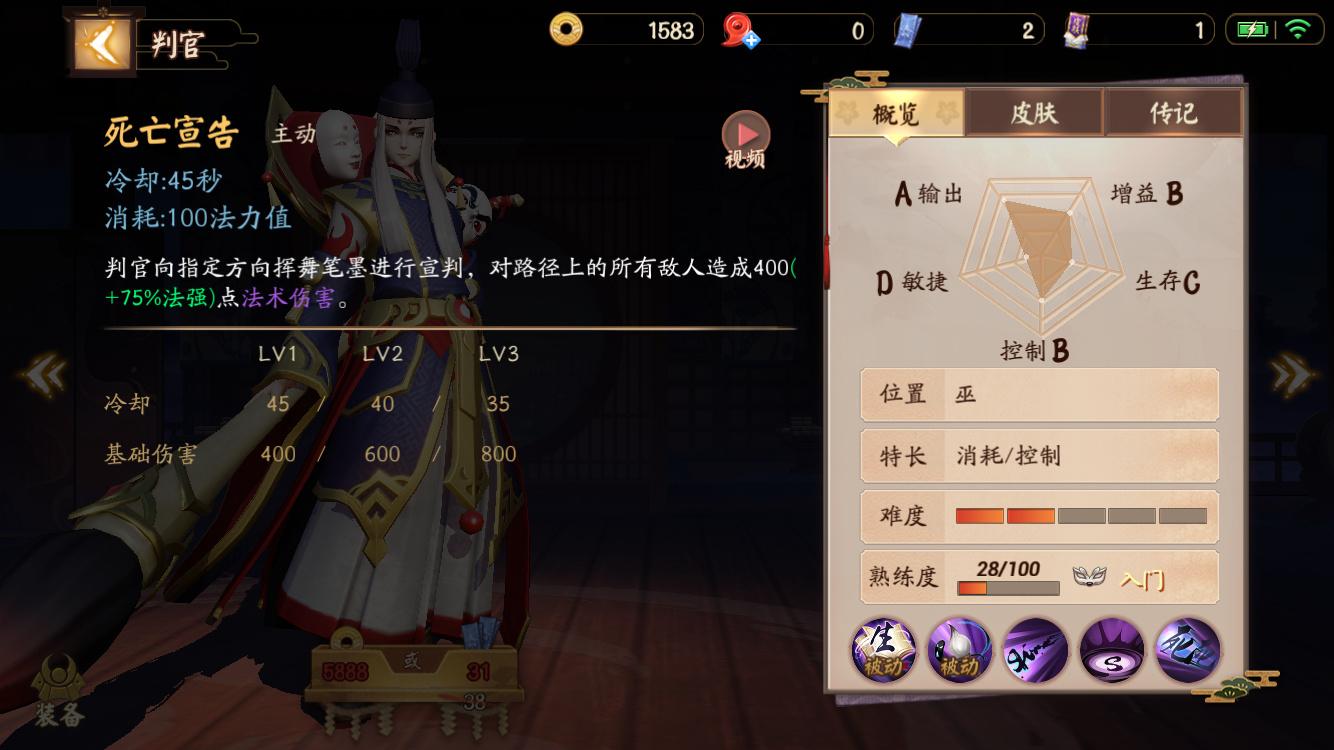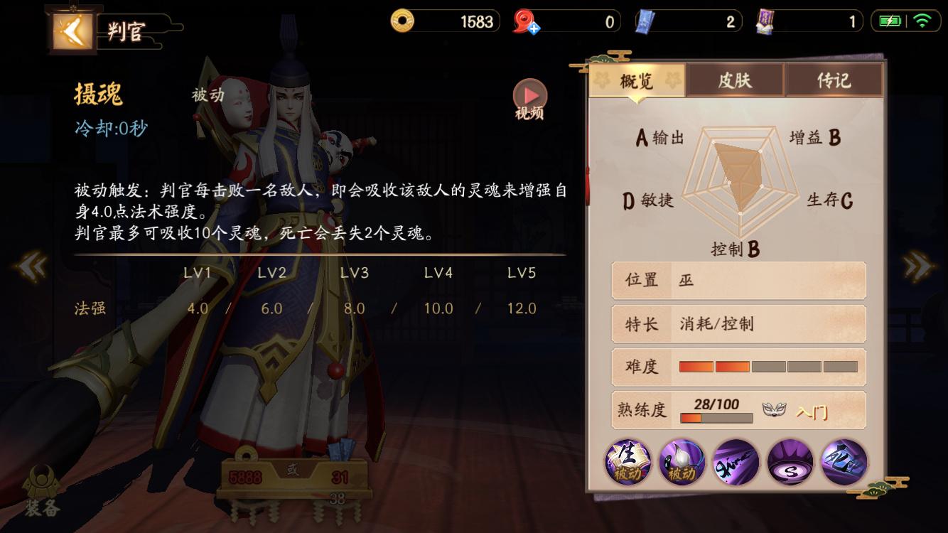 一技能是判官的BUFF技能,后期可以提供大量的法强加成,除了死亡之后会减少层数之外没有什么缺点。