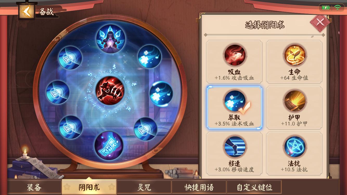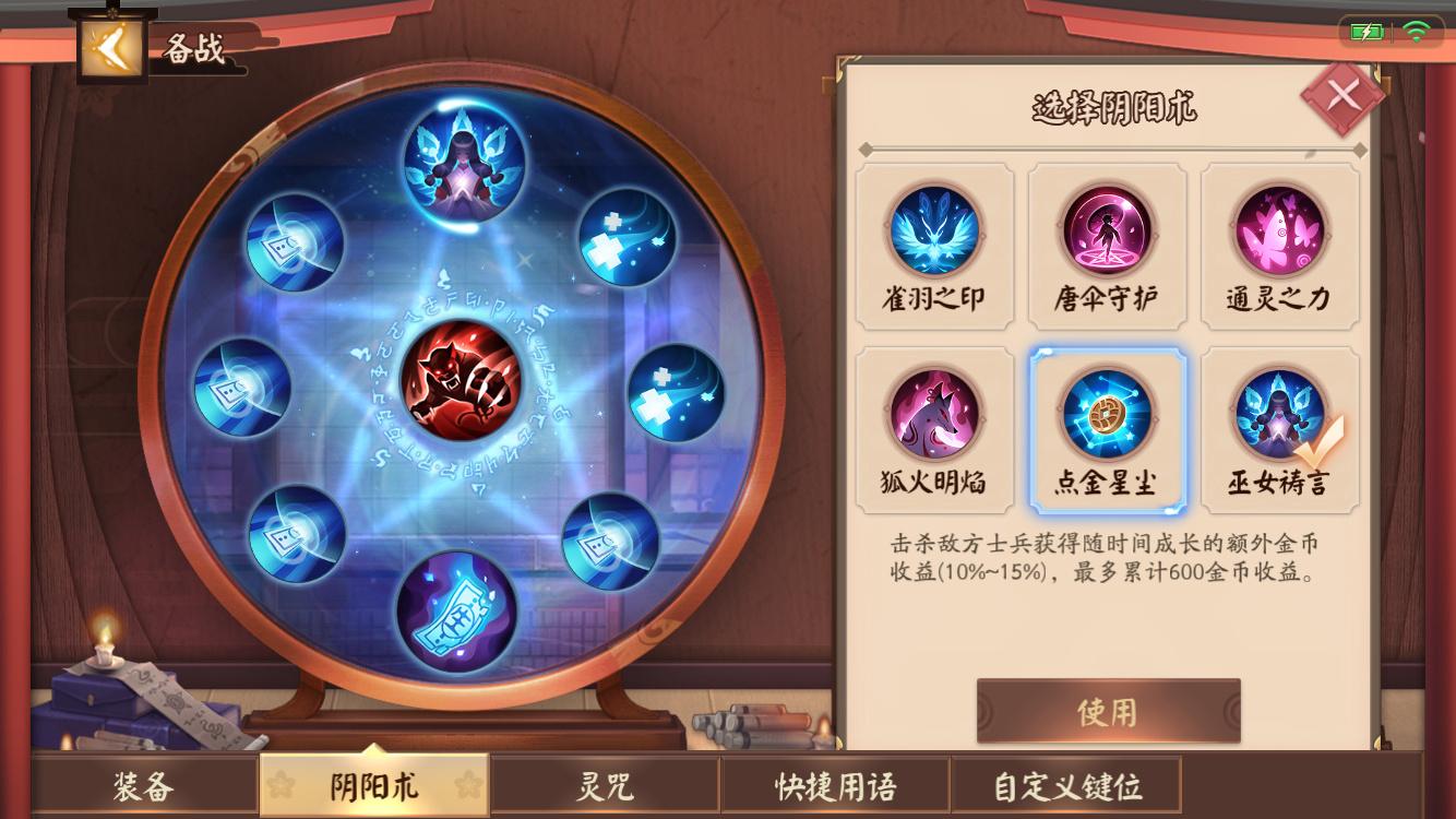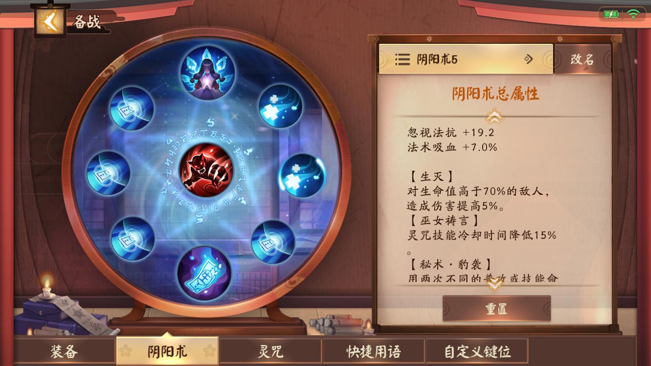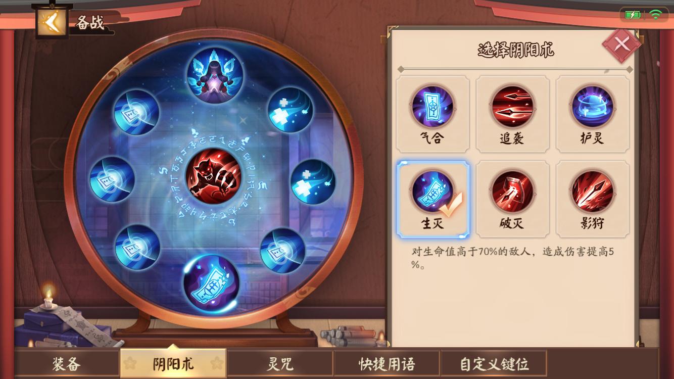 由于判官是非常传统的巫类式神,因此阴阳术的选择上直接使用系统默认的即可,如果想要替换的话,可以将默认搭配中的巫女祷言、气合和生命替换成点金星辰、生灭和法术吸血,点金星辰可以加快判官的发育速度,缩短装备成型的时间,生灭可以显著的提升判官的伤害输出,而移速则能够提升判官对线期的生存能力。