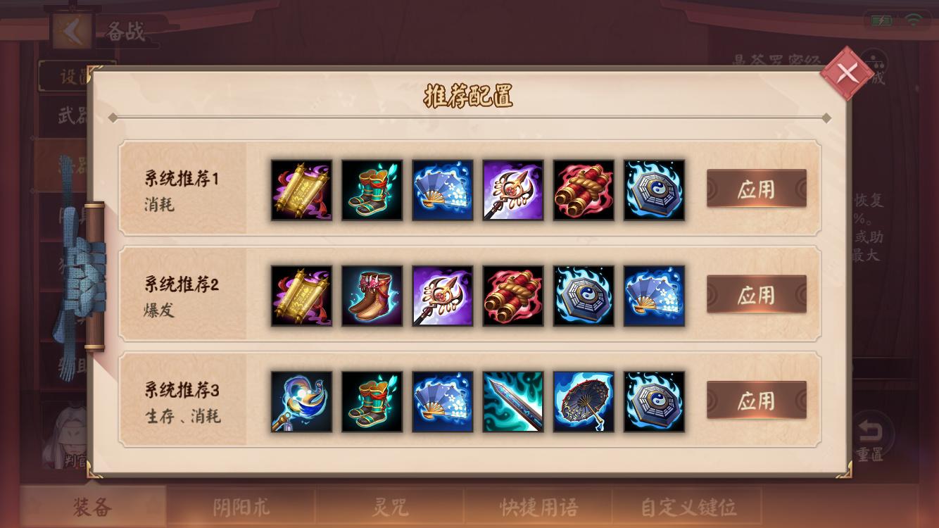 判官的装备搭配与阴阳术相同,由于是非常传统的巫类式神,在玩法和出装上并无太多的挖掘空间,因此直接使用系统默认默认出装中的——爆发即可。