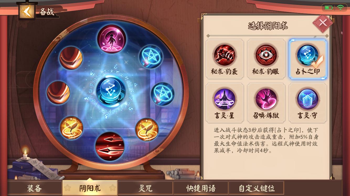 占卜之印可以说是没有什么输出能力的坦克式神的最好选择了,3秒钟一次附加自身最大生命值的额外伤害,可以有效的弥补山童在输出上的弱势,配合技能打出一次小爆发也是极好的。