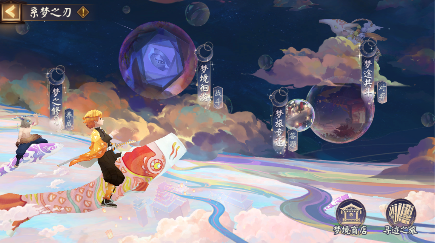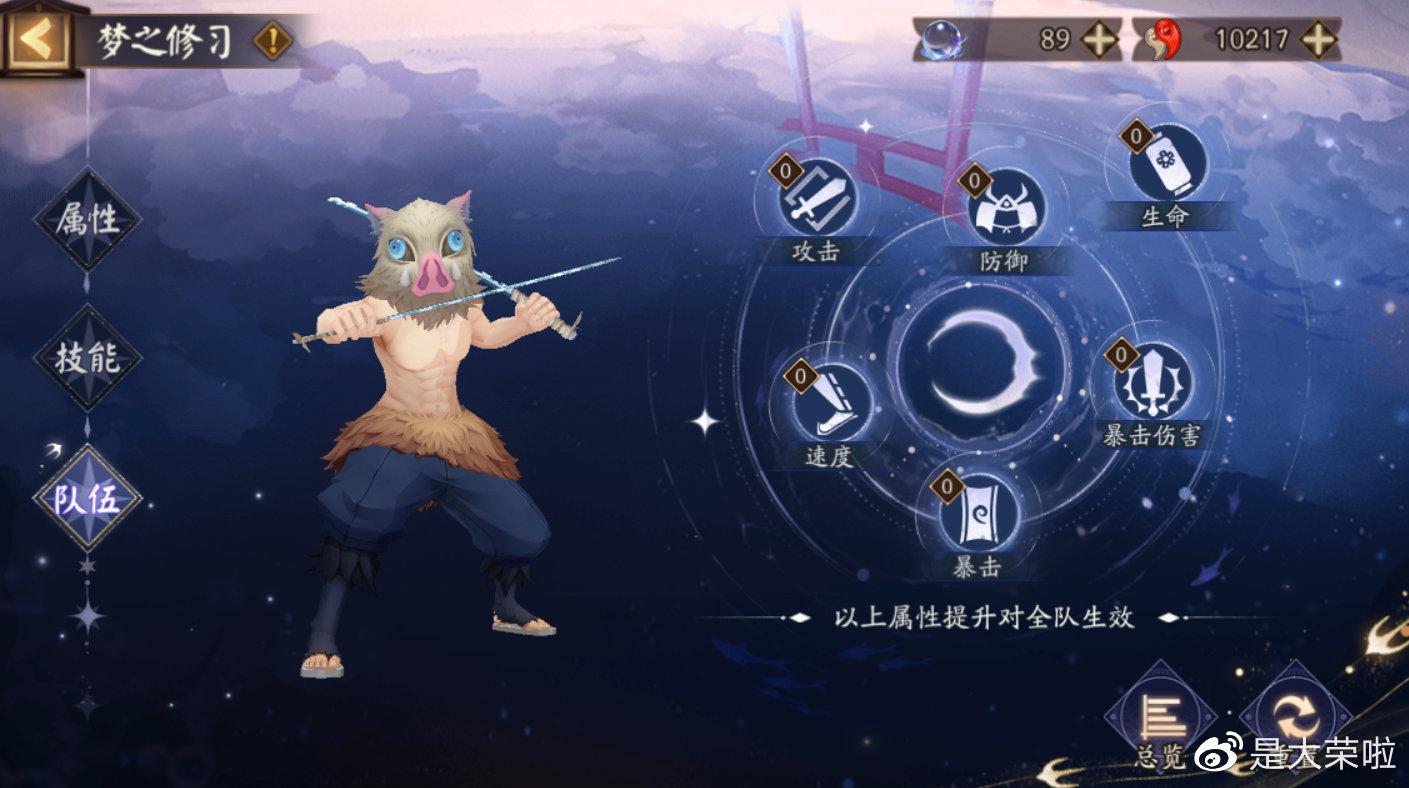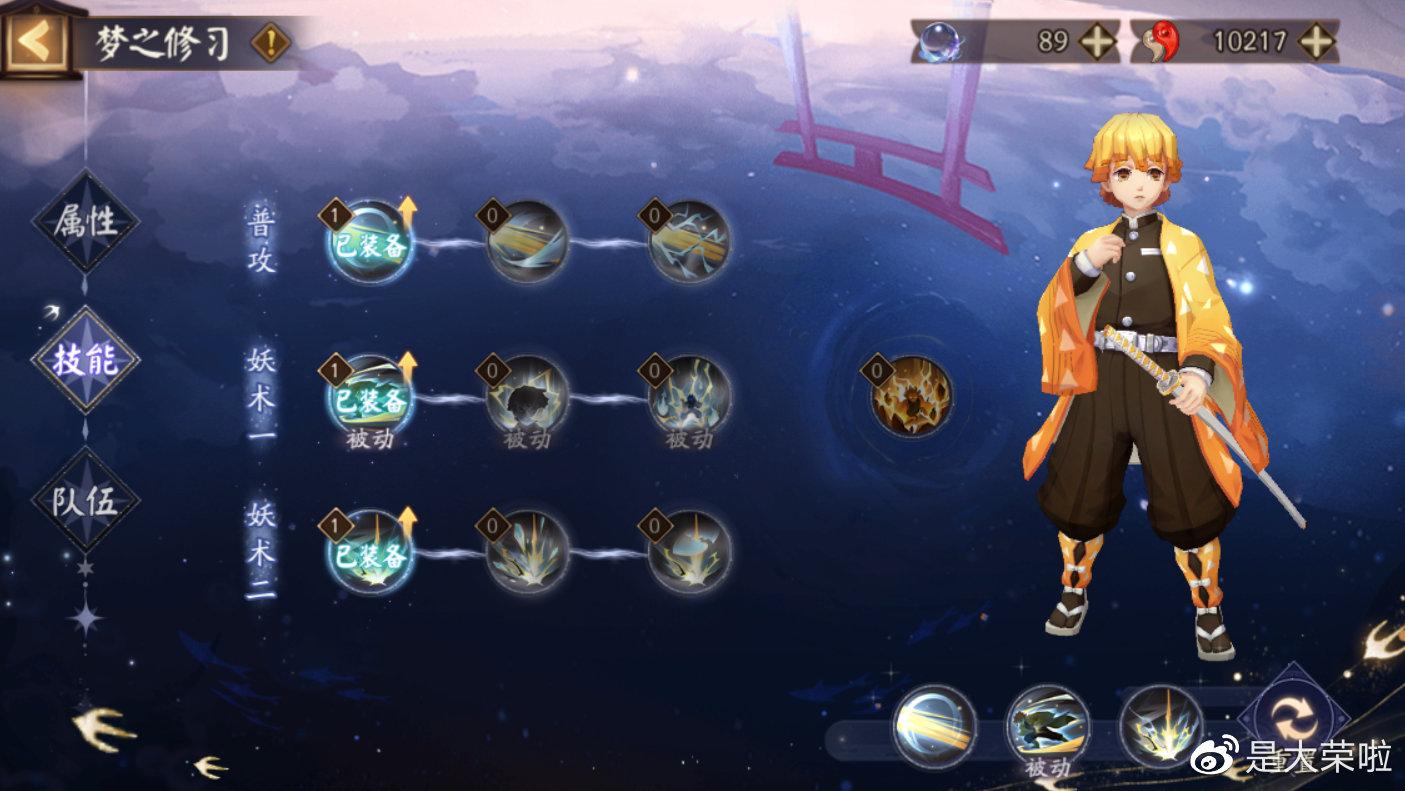 梦之修习分为2个部分:「属性」/「技能」是加强善逸的输出强度;「队伍」则是提升整体阵容的面板属性。
