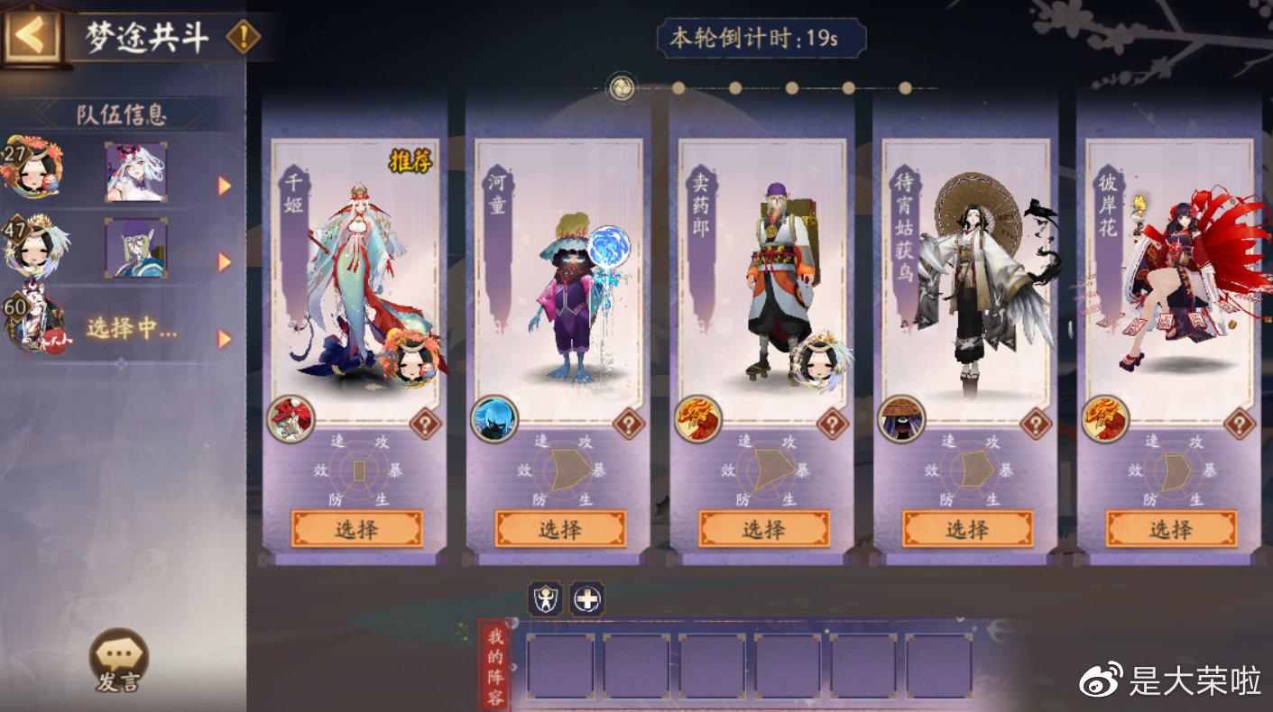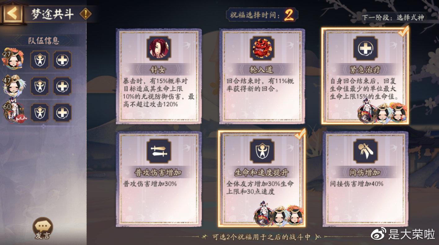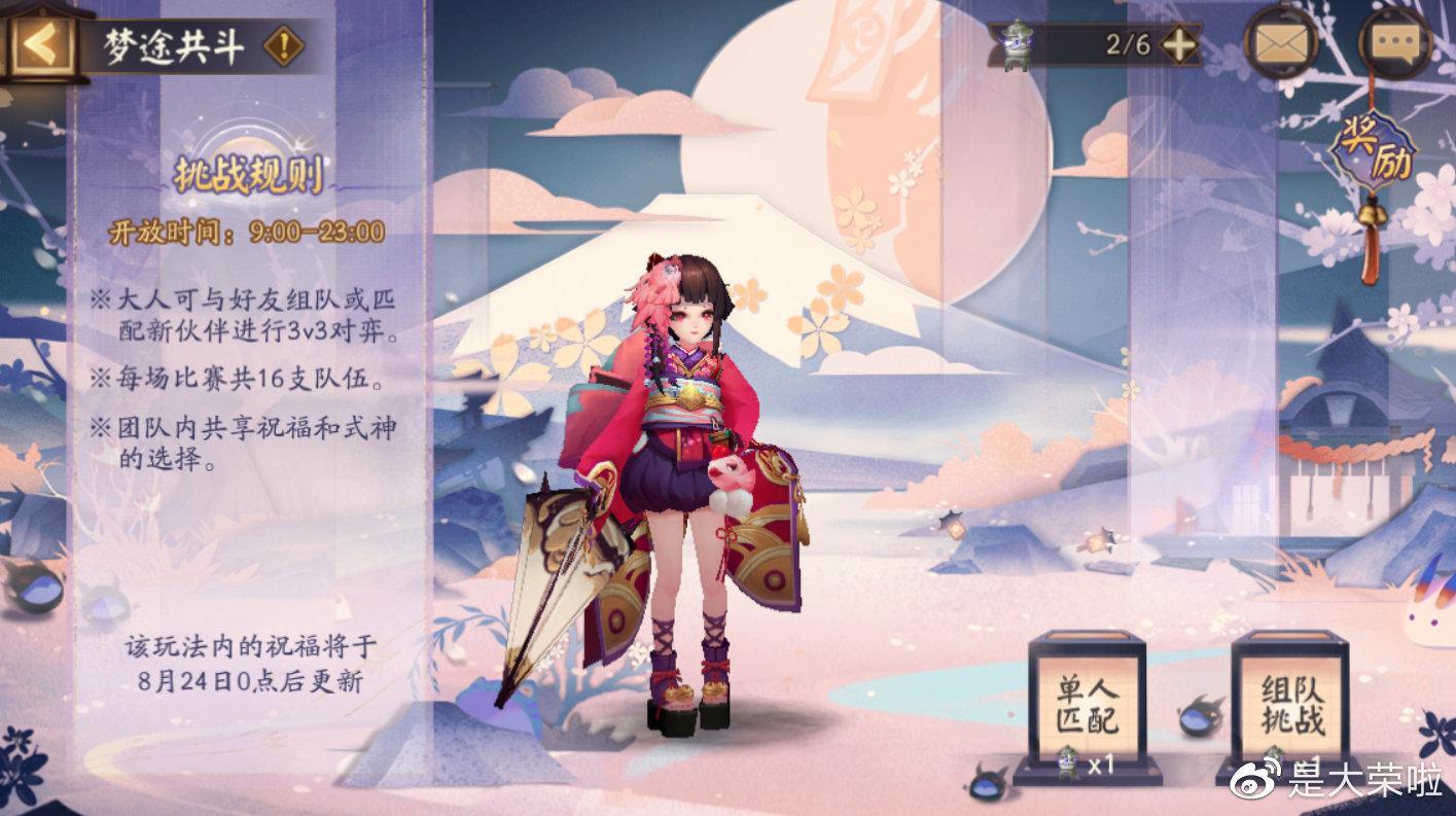 开局可以选择单体匹配or好友一起组队挑战,每场有16个队伍,开局式神+祝福是同样类型供选择,每局对战胜利条件为3局2胜(即3人,有2人胜出即为拿下本局),每胜利一局+5000活动分奖励。