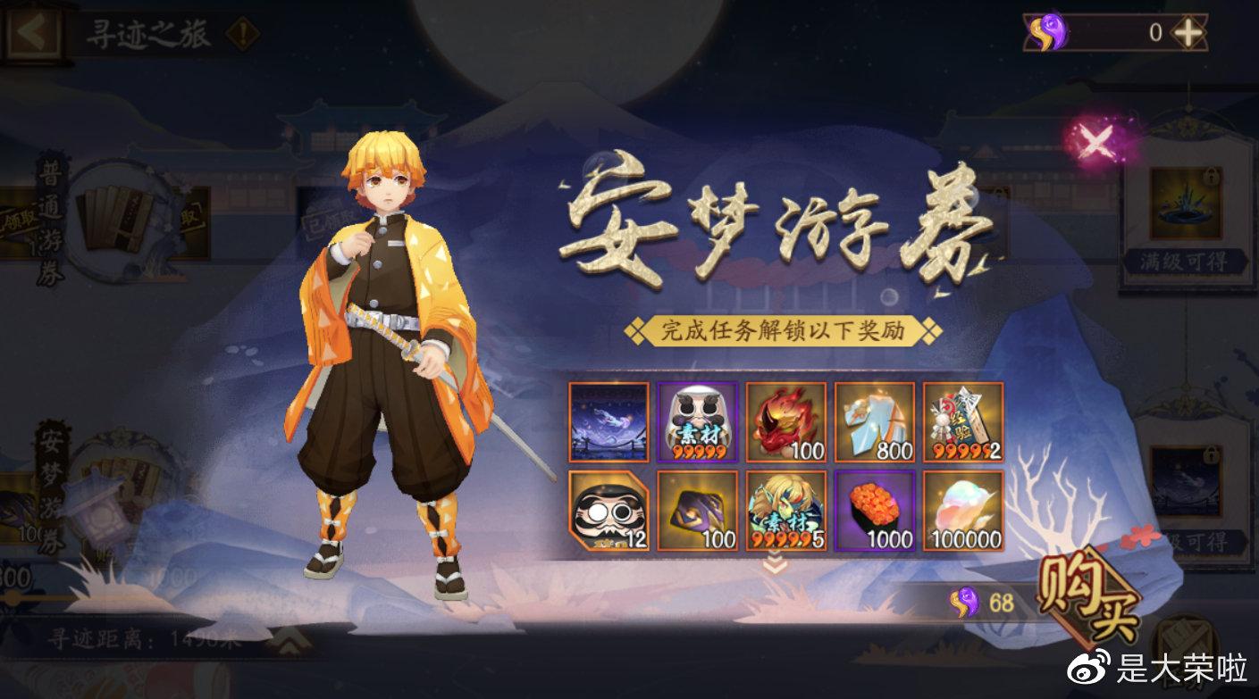 本次活动,善逸会替代阴阳师出战,伊之助提供队伍属性加成。