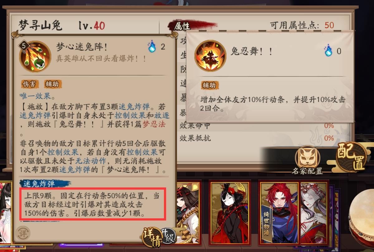 梦忍法:每层效果使三技能额外提高20%输出,上限9层。