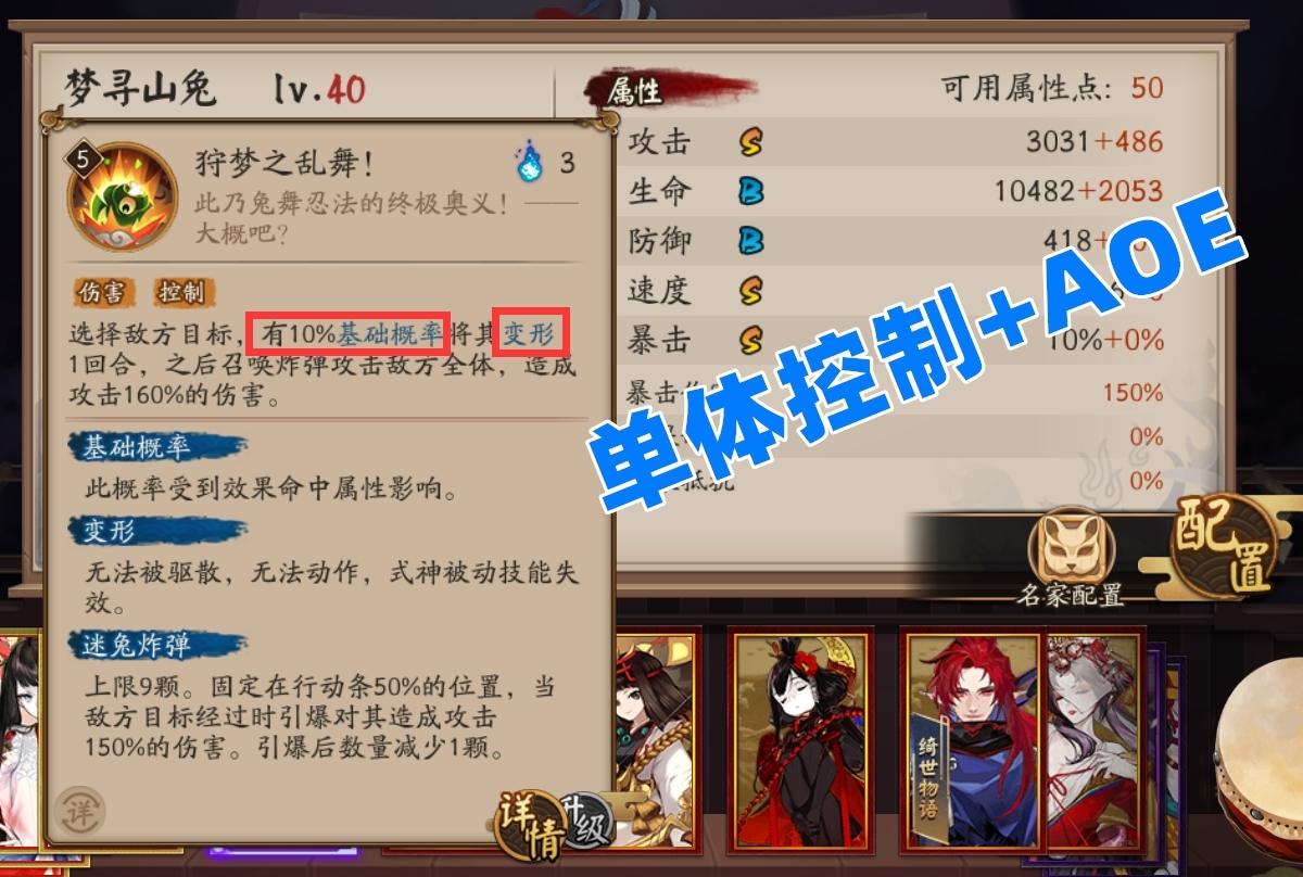 三技能中的控制效果算是赋予了SP山兔额外的就业岗位,毕竟只是拉条的话斗技中有太多太多比她强的式神了。三技能30%的基础概率、LV2增加的30%效果命中、配合炸弹减少敌方30%效果抵抗,只要御魂以速命生的方式进行佩戴,就能为SP山兔新增不容小看的控场能力。轮到自己的回合时,可以根据战局情况判断究竟是埋炸弹还是控住敌方关键式神。
