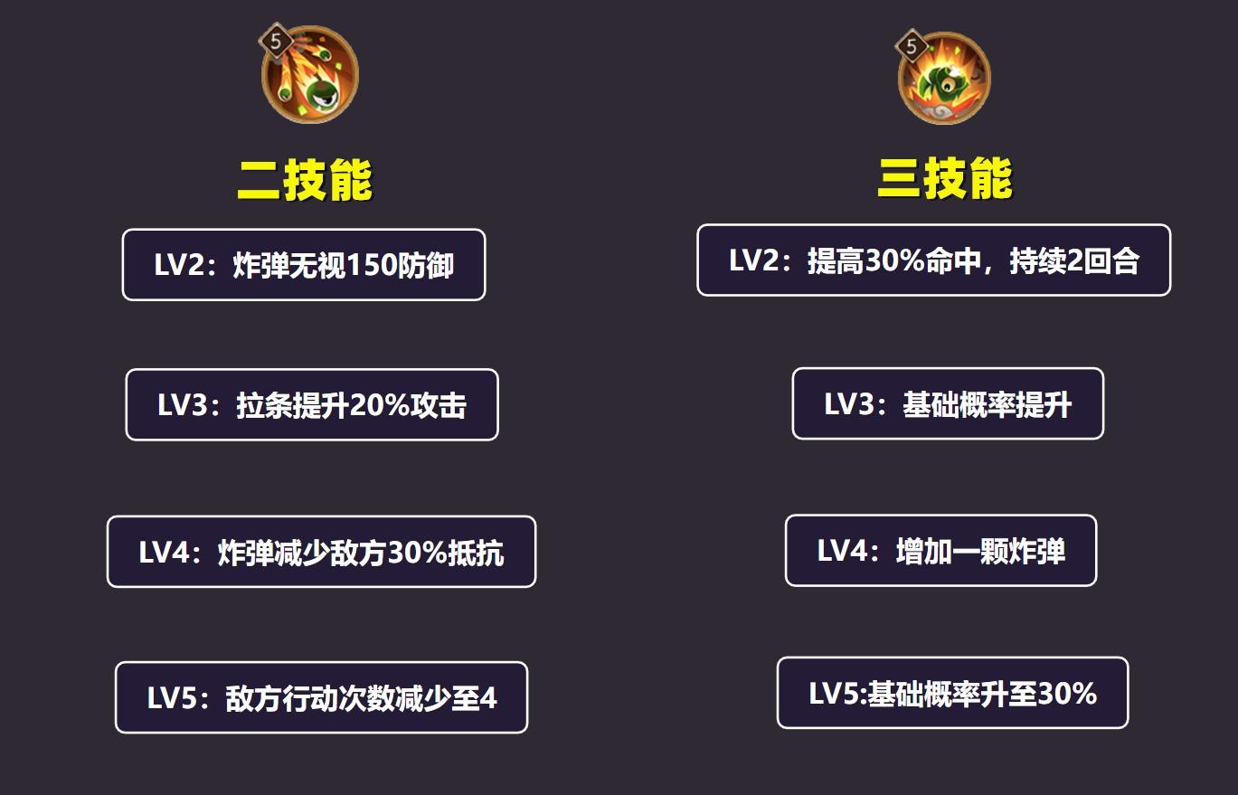 有趣的是,二技能还附带一条被动效果,当SP山兔未承受控制效果时,敌方行动5个回合(LV5变成4)后可以强制丢出两枚炸弹;反之,处于控制状态下则会强制驱散。