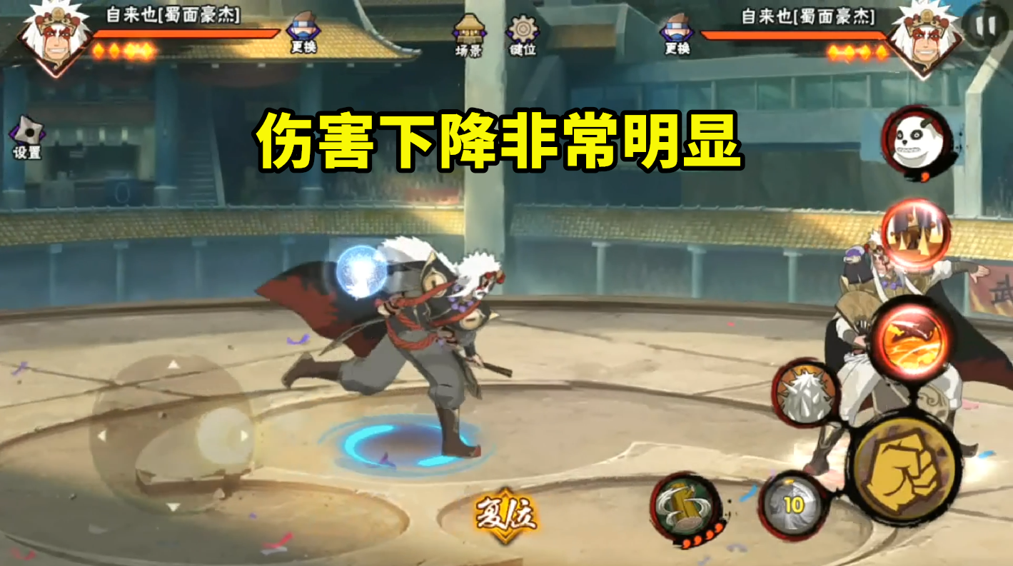 火影忍者手游的蜀面豪杰自来也的调整已经上线,根据我自己的实战和练习场体验下来,是可以很明显地感觉到跟之前版本的差异。首先第一个感知比较明显的地方就是技能和奥义的伤害,简单举个例子,原来一个普通的螺旋丸伤害大概是在45W左右,调整后的螺旋丸伤害降了差不多10W伤害,只有35W左右了。其他技能的伤害降低幅度也差不多,都是在8-10W左右,而奥义是从100W左右降到了80W左右,这个伤害是不包含后续的灼伤效果。而灼伤效果也比原来降低了很多,段数也有一定的减少,大概是从20W左右降低到了3W左右,这个幅度也非常大。
