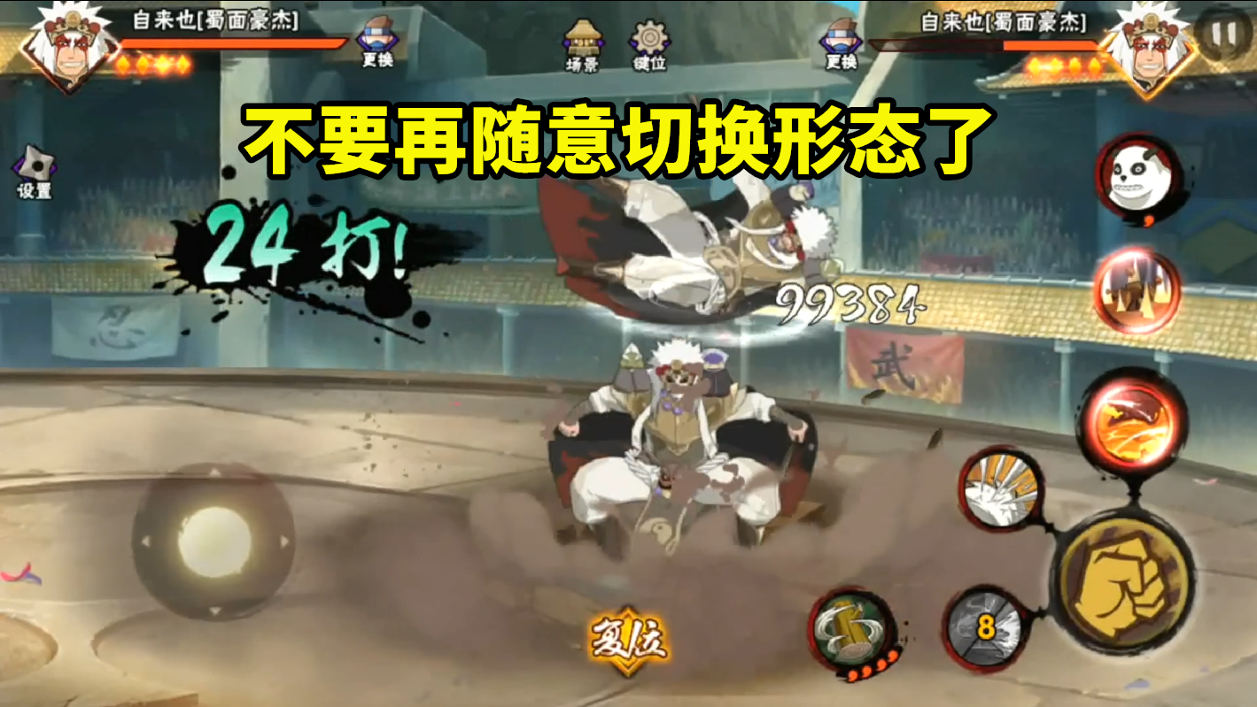 除了伤害以外,还有一个比较有影响的地方就是切换形态消耗奥义点,原来的版本是可以随意切换,没有任何限制。现在的蜀面豪杰自来也就需要尽可能的把当前两个技能全用完,然后再切换形态,这样才可以更好的拿到四个奥义点。如果你还是跟原来那样打个技能切换一下,然后再放个技能切换形态,这样你的奥义点就只会原地踏步。因为这个机制非常像是金角银角,所以,我在实战中也碰到了几次玩着玩着就没豆的情况。