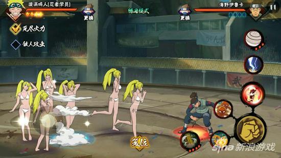 奥义技能-[后宫之术]:鸣人使用分身召唤出多个“鸣子”跑向敌人,随后本体“鸣子”使用飞吻,敌人流鼻血飞至空中终结;(很恶搞的一个技能,男女通用,大家可以试试)