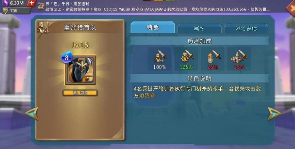 肉盾英雄和输出英雄我主要用的下面两位,后期把大斧换成了黑牙,图腾是非常核心的英雄,清对面的英雄主要靠他,可以看见他面板对英雄伤害是200%的,而且远程的脆皮容易活,不像铠甲虽然也是有加成但是冲上去就死。