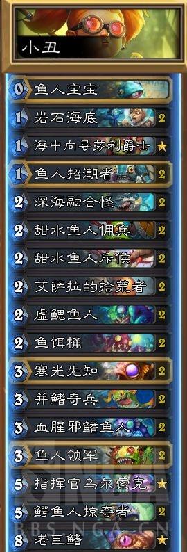 这套卡组是刚出迷你包的时候从nga的一个大佬哪里抄的,相比传统的鱼人术,把一张鱼人宝宝换成了指挥官。