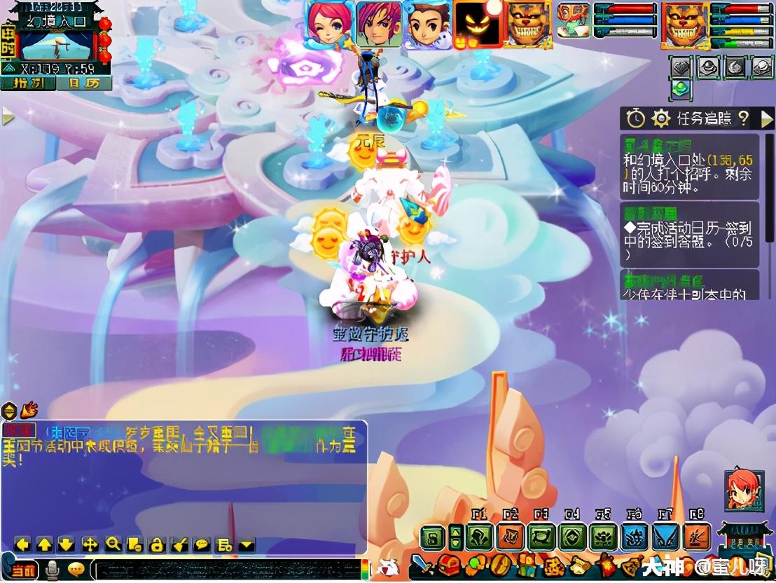 进入幻境后你可以选择躲避喷泉,躲避有成就。也可以选择不躲避直接组队后飞到天台即可。