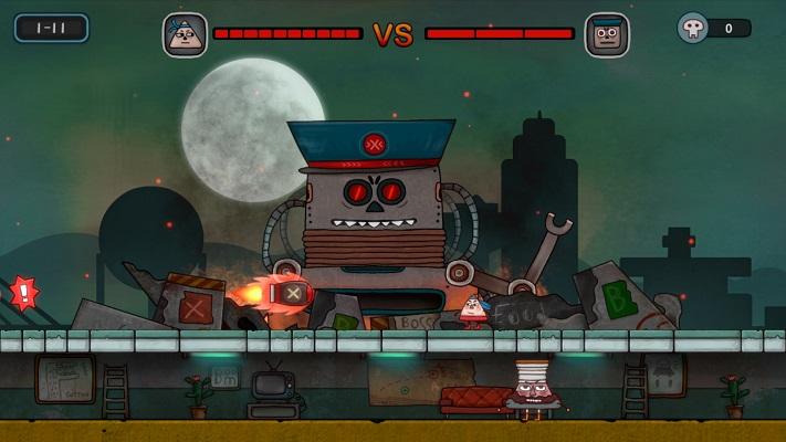 至于Boss战,在第一大关中,共有两种Boss战场景,分别是第一关中期的追逐战,以及关底的最终战。前者需要控制小三角逃脱巨型机器人追捕,发挥跳跃技术一气过关。后者则营造了格斗游戏的对决现场,在躲避各式导弹、废弃零件狂轰乱炸的同时,还要瞅准时机抓住空挡,进行反击。