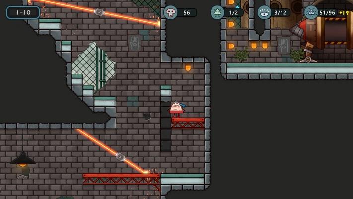 “小三角”几乎汇集了你在过往平台游戏中所遇到的所有套路:岩浆、激光、一踩下即消失不见的地板,以及伺机靠近你的敌人们,让你一蹦三尺高的弹簧。这些要素排列组合以后,便构建了一段段精致“讨厌”的关卡内容。这意味着你的跳跃必须精准,稍有不慎就得重新来过。