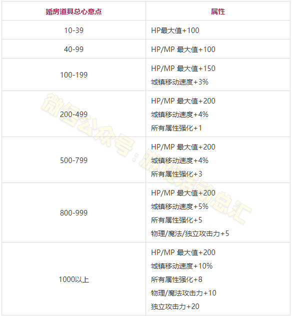 从下图可以看出,当婚房所有道具总心意点达1000及以上时,婚房属性即可达到最大值。