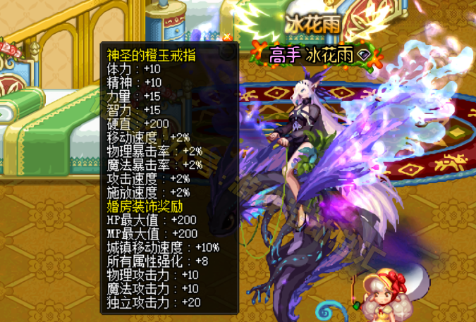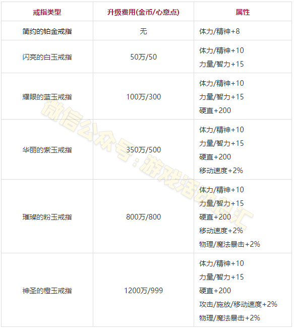 花雨建议先拿出1000心意点将婚房属性拉满,之后用剩余的心意点升级戒指,因为从[耀眼的蓝玉戒指]之后每次升级基本都是增加一些不会影响伤害的属性