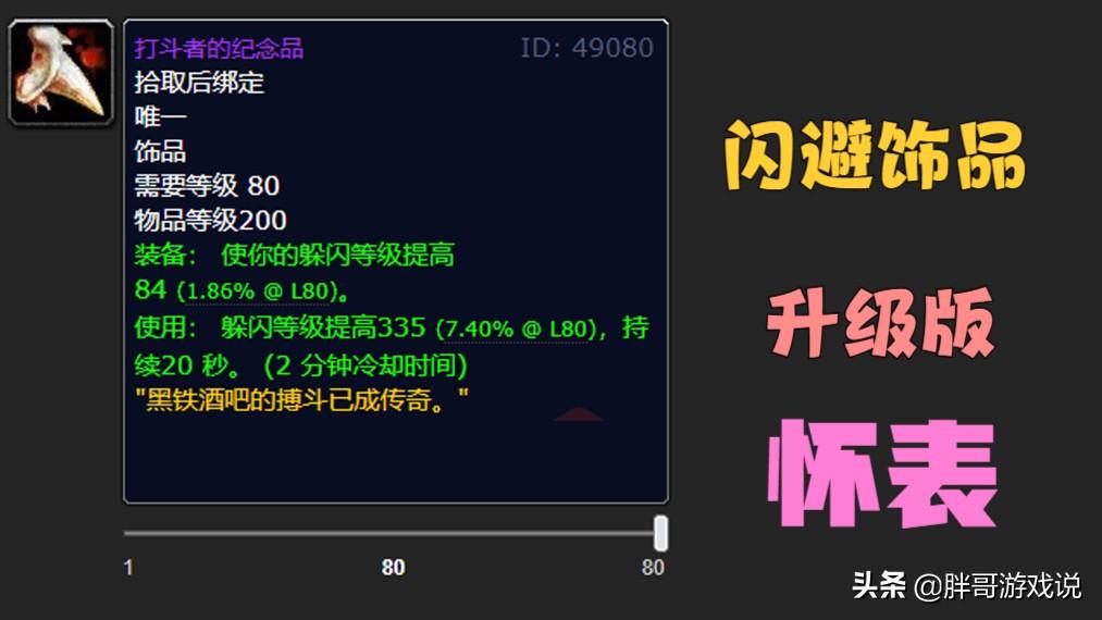 第二款饰品是打击者的纪念品,常驻属性为84点闪避等级,主动特效为335点闪避等级,持续20秒,CD2分钟。