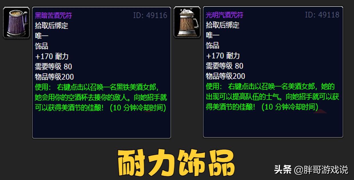 TBC版本初期很多玩家都通过美酒节活动获得了与牌子装属性完全一致的饰品,而WLK版本同样有美酒节活动,并且还加入了6款新饰品,这些饰品的属性也非常优秀。