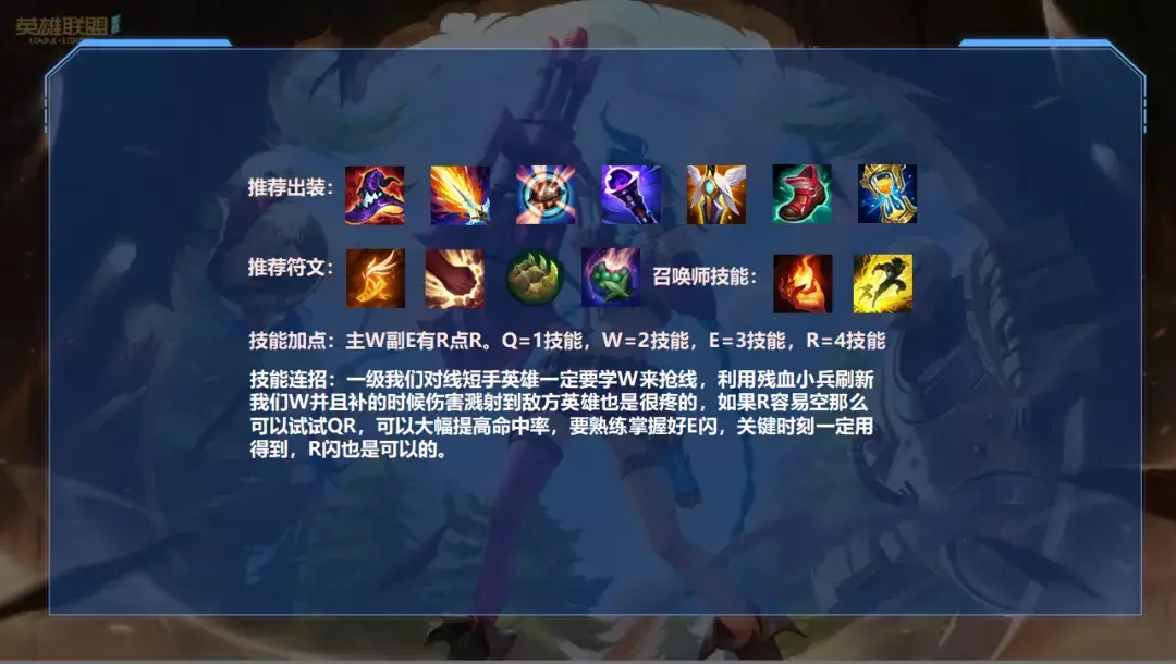 技能连招:一级我们对线短手英雄一定要学W来抢线,利用残血小兵刷新我们W并且补的时候伤害溅射到敌方英雄也是很疼的,如果R容易空那么可以试试QR,可以大幅提高命中率,要熟练掌握好E闪,关键时刻一定用得到,R闪也是可以的。