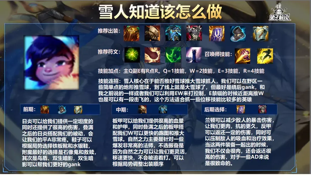 对线长手短手我们带迅捷步伐都非常舒服,最重要的是小天府,骸骨可以让我们面对一些爆发英雄很舒服,比如劫这种打一套爆发的,如果是对长手英雄可以带复苏之风,不知道怎么选就带适应性外壳。