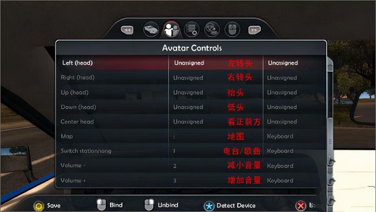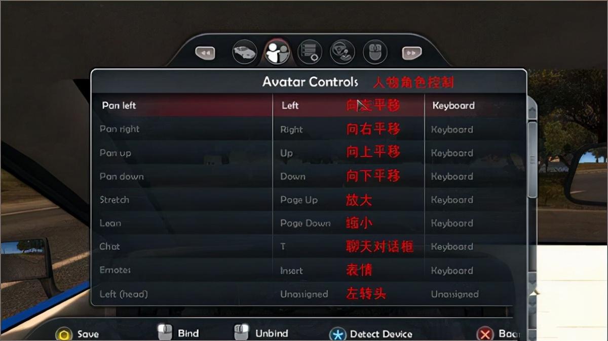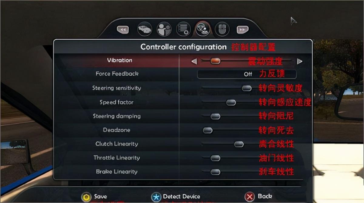 因为有时候用盘子不方便,每次装拆都很麻烦,所以是用的鼠标控制转向功能,这里先提到,但具体的方法和设置再近期的更新中写到,有兴趣的朋友到时候可以看下~如果是键盘玩的话,这里的力反馈关闭以后,会稍微好点~ 但变化不大,还是很难控制转向,所以可能以后键盘党需要单独练习一下自己的鼠标转向技巧了,鼠标的线性其实很牛X~ 关键是看你有没有兴趣练习了~ 这里只是简单地把翻译图示放出来,过后会很详细的讲解如何让键盘党玩家拥有最真实的驾驶控制感以及鼠标控制方向的教学~