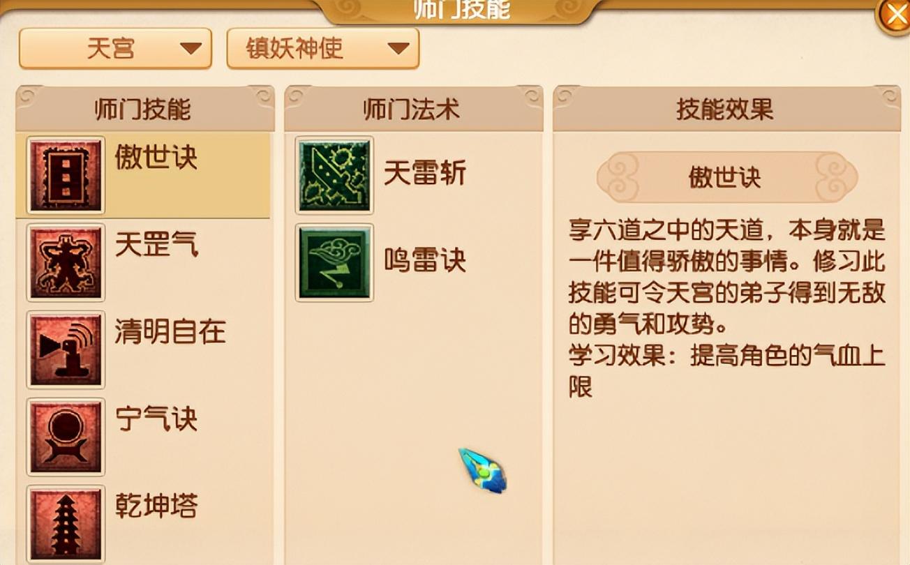 主技能傲世诀加气血上限,还有主要输出技能天雷斩也在这个下面,如果说成本低一点,只点这一个技能就能用了。