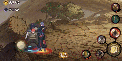 一技能:砂铁陀螺,蝎控制三代风影傀儡使用一个高速旋转的陀螺向前攻击敌人,攻击中敌人会将其击飞,有吸附能力,可以扫地。
