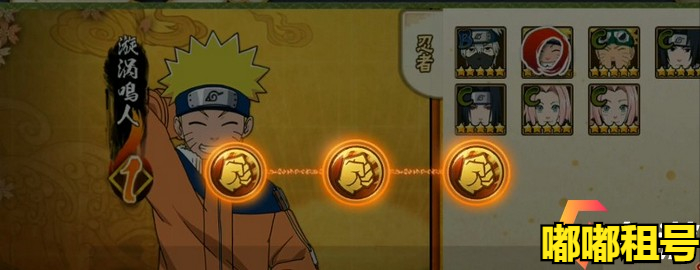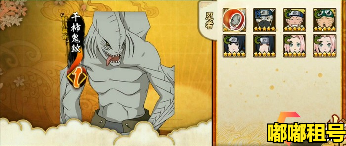 还有一种方法是,在选择忍者界面中,按照下面的选择顺序,从鸣人、佐助、卡卡西、小樱、鸣人,然后最后点击出战后,就会出现3个小拳头,然后把这三个小拳头都点一下,就可以直接将鲛肌融合的鬼鲛激活了。