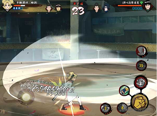 也可以以普通攻击起手打完敌人一套将敌人击飞,这里说下为什么小李可以用普通攻击起手,原因很简单,因为小李“手长”,小李的普通攻击有效距离比一般忍者都要远,同样的位置,小李可以打到别人,而其他人无法打到小李,这就是小李的优势。