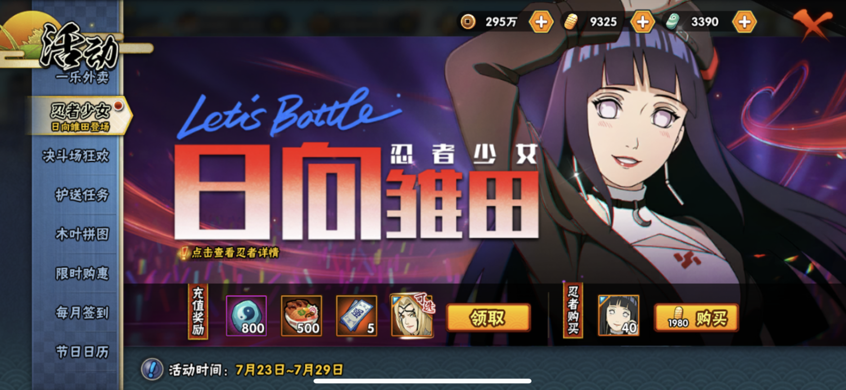 火影忍者手游的女团系列忍者在雏田上架的时候统一修改成了“忍者少女”,但我还是习惯性地叫女团忍者比较顺口,所以文章内还是以女团雏田来称呼。先来说一下这个忍者的招募方式,根据测试是跟圣诞忍者完全一样的机制,充50元的金币或者点券都可以激活购买资格,然后再消耗1980金币购买女团雏田。其实这个招募方式相较于需要点券购买的B忍来说,已经算是比较良心了,特别是恰好卡在这个时间点续费月卡的玩家,只是额外掏了1980金币而已,反正都是需要续费月卡。