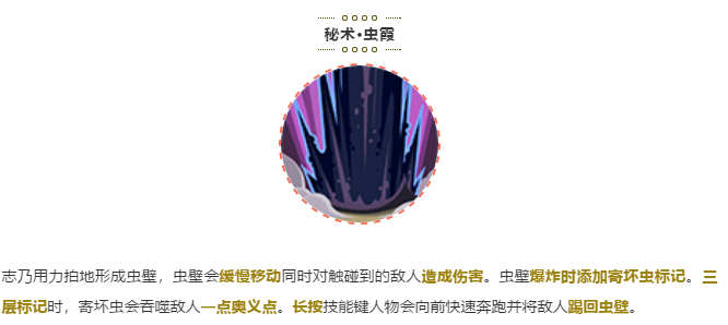 一技能:志乃拍地形成虫壁,虫壁会移动时会对触碰到的敌人造成伤害。虫壁爆炸时添加寄坏虫标记。三层标记时,寄坏虫会吃掉敌人一颗豆子。另外长按技能键,人物会向前快速奔跑并将敌人踢回虫壁。