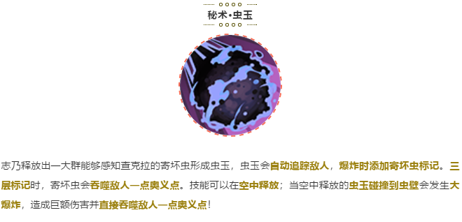 二技能:志乃放出一大群虫玉,虫玉会自动追踪敌人,爆炸时添加寄坏虫标记。三层标记时,吃掉敌人一颗豆子。技能可以在空中释放(惊了,这个技能可以在空中释放)当空中释放的虫玉碰撞到虫壁会发生大爆炸,造成巨额伤害并直接吃掉一颗豆!