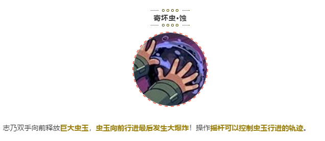 大招:志乃放出巨大虫玉,虫玉向前进最后发生大爆炸!另外操作摇杆可以控制虫玉行进的轨迹。