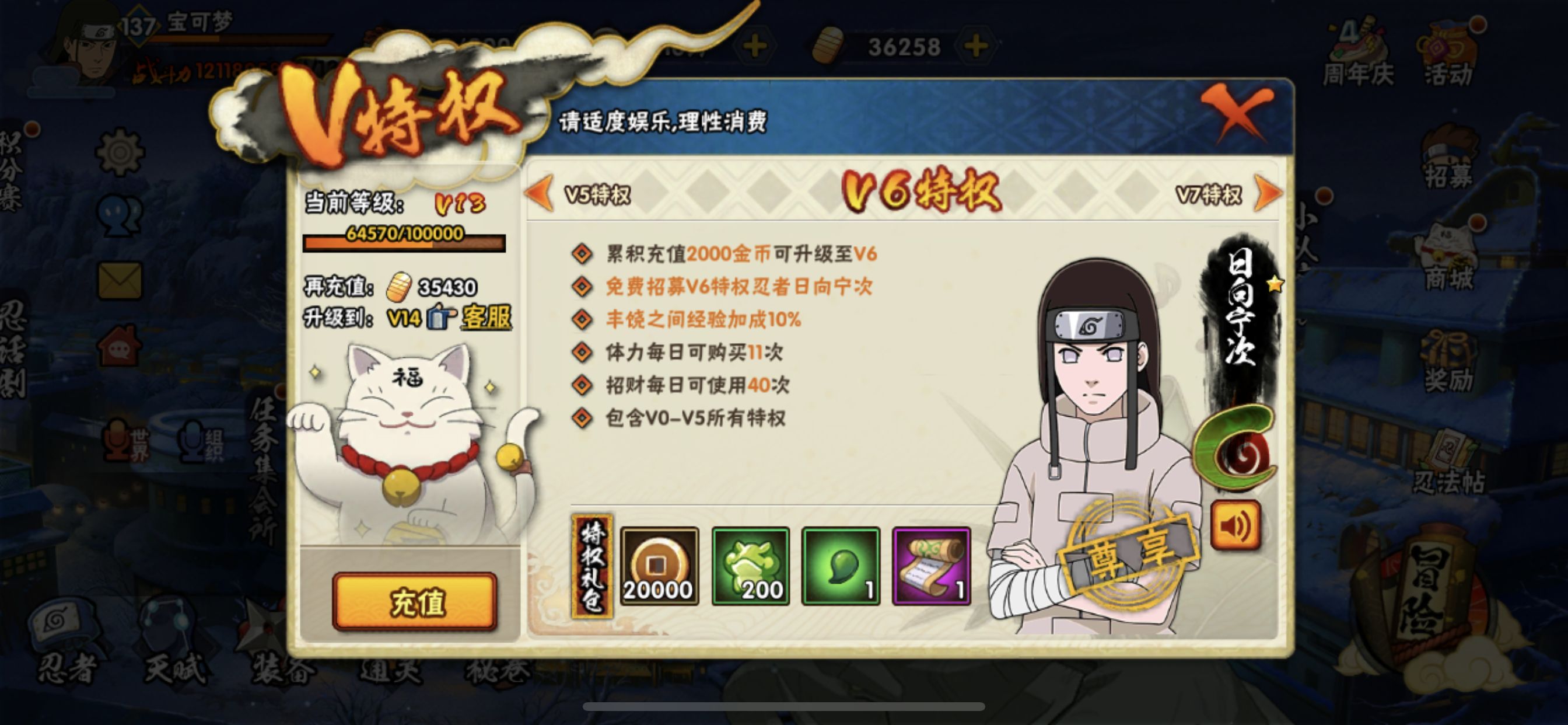 这个日向一族的天才,在忍界大战中为了保护雏田和鸣人牺牲了自己,很多玩家也因为他的死感到伤心,当初看到这个剧情的时候也是有点泪目,对于这个忍者的上架我一直比较期待,通过早期魔方在V特权设定的忍者中可以看到,宁次的定位并不低,因为在游戏刚上架之初,也是为了鼓励玩家氪金升V特权,所以在V6的特权中加入了一个C忍的宁次,强度方面不用过多的讨论,这个主要就是一个情怀忍者。