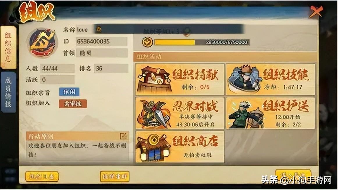 火影忍者中这个组织是至关重要的,尽量大家还是加入比较厉害一点,管理得当的组织去,这样才能保证我们奖励都能轻松拿满。那么本期的介绍到这里就全部结束,如果还想了解更多精彩的游戏攻略以及资讯的话,可以多多关注小狗手游网。