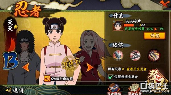 天天,火影忍者中一个有着中国风的妹子,无奈原作中出场几率不高,忍术也多以忍具为主,并没有很大的人气,不过玩家们通过羁绊纸卷与秘宝之卷中很容易收集到天天这个B级忍者的碎片,所以召唤出天天只是时间问题,下面小编带来哦了火影忍者手游天天使用心得,感兴趣的玩家一起来看看吧。