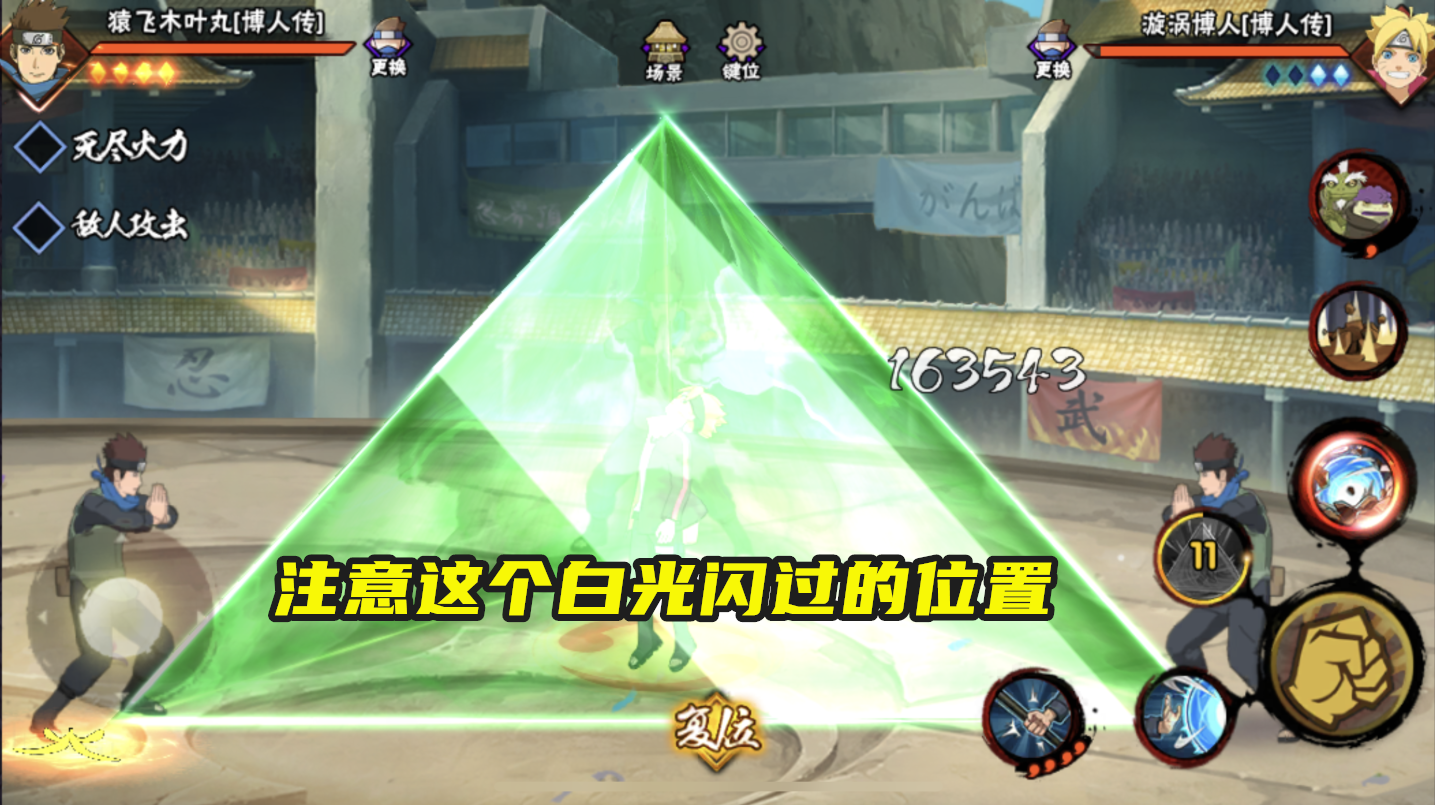 接下来再说一下我对于博人传木叶丸的看法,最近一直有玩家说博人传木叶丸太难打了,简直是一个阴间忍者,三方封印的范围这么大,而且也完全看出来哪个是本体,哪个是分身,就更没办法先手了。其实,快速找出博人传木叶丸三方封印的真身有个小技巧,就是通过三方封印的闪光方向来快速区分,各位可以看下图,如果这个三方封印的白光从左侧往右边亮,那他的本体就会在左边,而如果白光是从右边往左边亮,那他的本体就会在右侧。