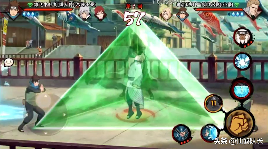 二技能:三方封印,具有抓取且封印技能的效果,出现三个分身,有无敌判定,通过摇杆控制本身出现的位置(二代土影无:这技能我熟),三个位置可以选择,更加的灵活,而且分身会持续一段时间,这个时刻使用螺旋丸,相当于组合技,3个螺旋丸,可以移动控制分身的位置,增加螺旋丸攻击的范围。