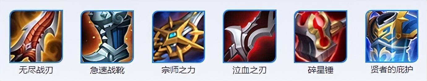 无尽战刃+急速战靴+宗师之力+泣血之刃+碎星锤+贤者的庇护,这套装备在保证了鲁班长号输出的情况,又可以避兔被敌方刺客抓死的尴尬局面。