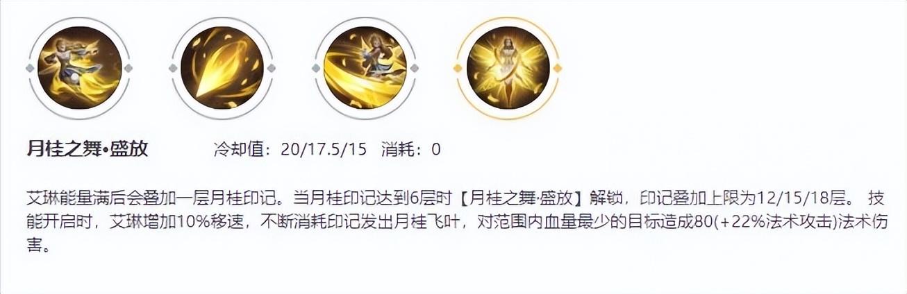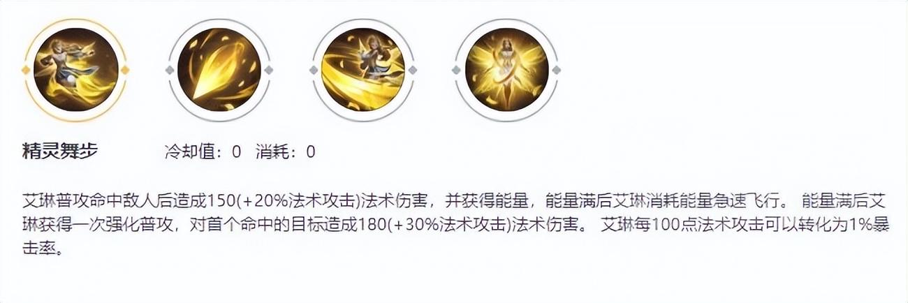 技能效果2:艾琳每100点法术攻击可以转化为1%的暴击率,这个被动乍一看艾琳很适合走暴击流但其实转化的条件还是比较苛刻的,1000点法强的艾琳也仅仅只能转化10点暴击率,收益太低,远远不如直接叠法强来得直接。