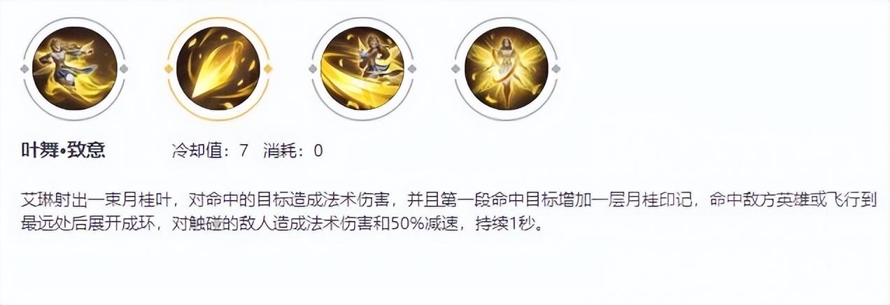 技能效果:艾琳射出一个圈圈对命中的目标造成法术伤害,并叠加一层印记,圈圈命中英雄或者达到最大飞行距离会展开,对触碰到圈圈边缘的敌人额外造成法术伤害和减速效果(类似李白的二技能),需要注意的是一技能只会对命中的敌人和触碰到圈圈边缘的敌人造成伤害,圈中心的敌人是不会收到伤害的。