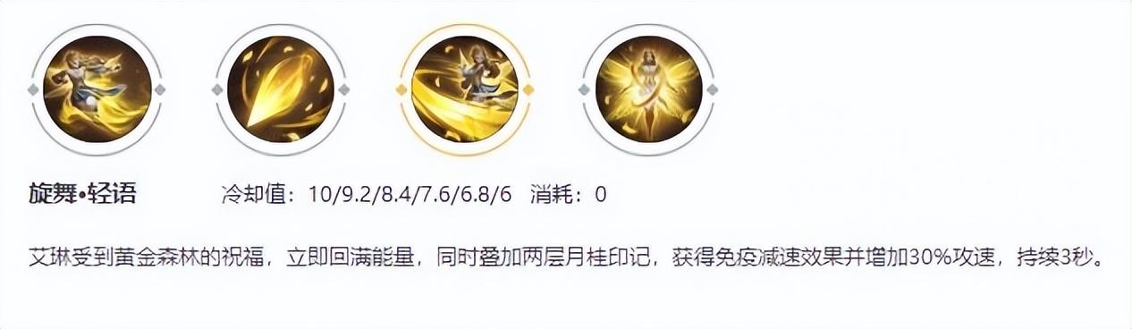 技能效果2:当艾琳的印记处于6层及以上时点击大招后可以获得10%的移速,并对周围血量最少的目标不断的发射月桂树叶造成伤害,大招释放期间艾琳不能普攻和释放一技能,但是可以释放二技能,金身和被动不会打断大招的释放,大招的释放时机一般都是用于收割或者对面英雄突脸时利用大招加速反打,需要注意的时大招释放期间使用二技能也可以叠加大招印记的,所以满印记时不要23这样会浪费2层印记,改为32连招可以让大招伤害最大化。