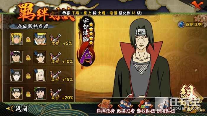 首选,从游戏界面看到,羁绊对战是一个独立玩法,取代了之前修行之路的入口位置(当然修行之路和生存挑战并入了试炼之地),进入羁绊对战界面可以看到左边是每天随机推荐多组羁绊忍者,虽然有推荐,但是不代表你过会对战就可以选择,因为这是要看你的目前都招募了那些忍者,如果没有招募到的,怎么推荐也没用。当然如果你都有推荐的忍者,那么这个玩法还有个好处就是帮你五星加成,也就是说忍者的战斗数值都经过平衡处理,保证了公平性。