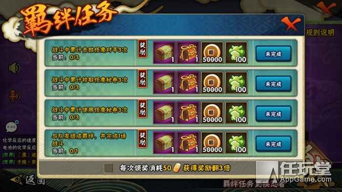 接下来要说下羁绊对战有什么规则:1.跨服2V2从字面上来理解就知道需要组队,你可以随机组也可以创建房间好友一起打;2.每天推荐的4组有羁绊关系的忍者,使用羁绊忍者出站时候会有攻击加成,如果是每天推荐以外的羁绊忍者可能就没有攻击加成了;3.每天会有4个羁绊任务要完成就可以获取奖励了,只要每天任务是否都相同,那就要多做几天才知道;4.任务及其奖励会在每日凌晨5点重置。