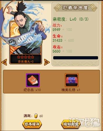 这个就是好感度界面了,玩家可以用忍币或者材料来提升玩家与角色之间的好感度。亲密度的提升会增加角色生命值与攻击值。