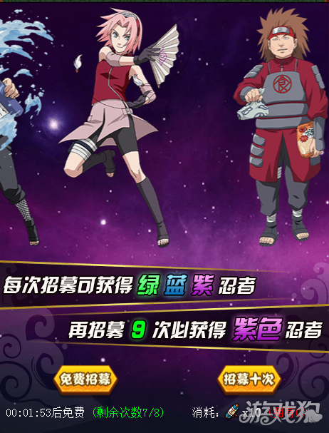 这里是招募界面,大部分的角色就是从这里产出,每天免费招募最多有8次。每隔一段时间恢复一次。每招募10次稳定获得一个紫色忍者,十连的话也是一样稳定获得一个。