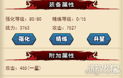 这边可以看见武器的属性,强化80级,精炼0级,战力3763,攻击7527。