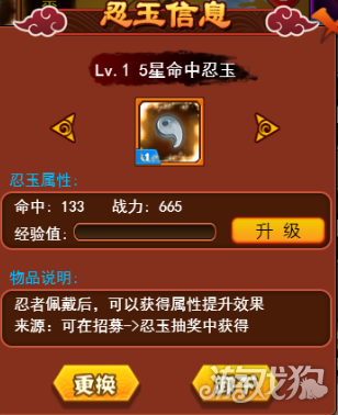 这是忍玉的界面,五星命中忍玉,增加命中133,增加战力665。名字是命中就只加命中和战斗力,这就是纯粹。