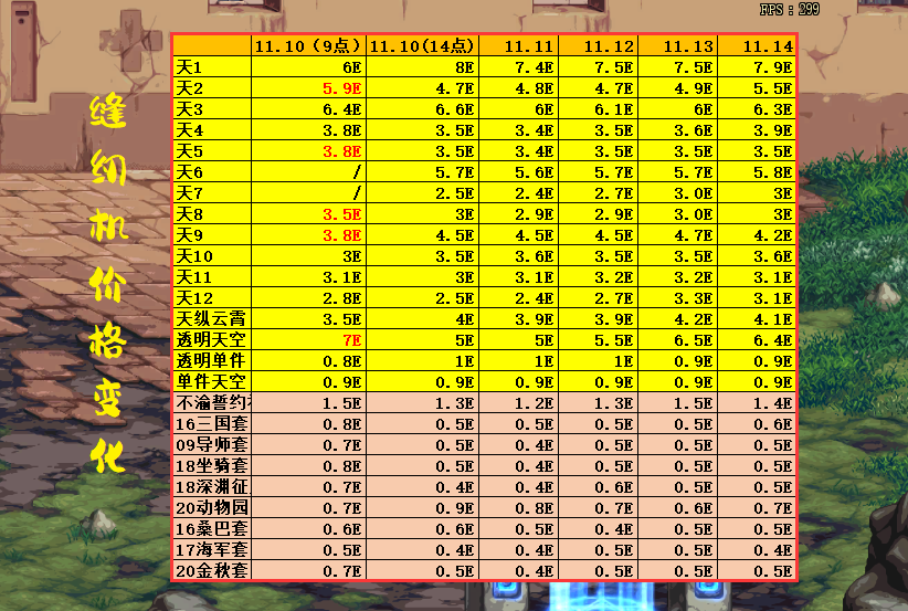这里以跨3a大区为例,统计了缝纫机活动上线以来5天时间的价格波动,因为各个跨区的金价、购买了都有所不同,所以仅供参考,然后咱们再来一起看看,到底什么时装值得入手?